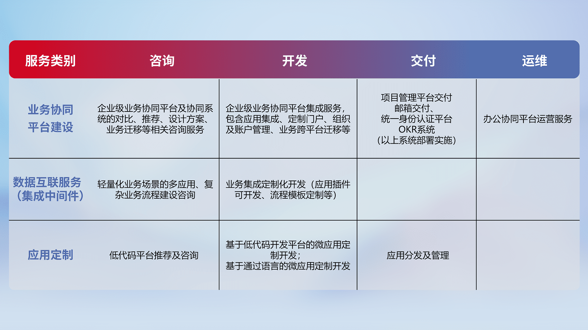 针对钉钉、、、、企微、、IDaas等平台级产品提供产品的规划、、、方案、、交付、、、、定制化开发等服务,,实现如统一协同办公、、、、智能客户服务、、混合会议管理、、、智能数据查询、、、、等业务场景,,,,实现数字化转型。。