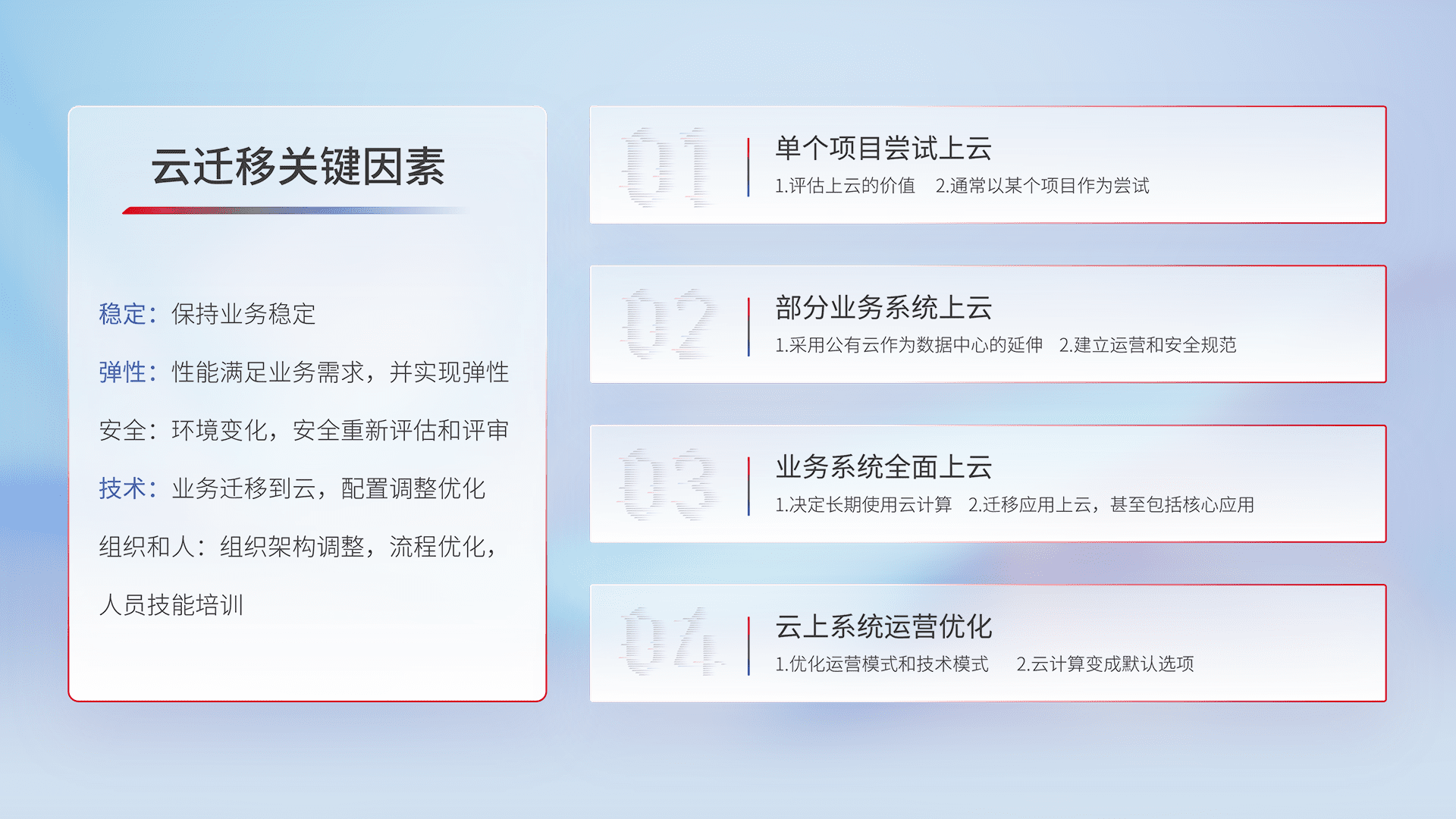 结合实际业务,,从规划设计、、、、云平台选型、、云原生改造、、、数据迁移、、集成交付,,迁移全过程为客户识别最佳上云路径,,,做好风险识别管理,,设计网络架构、、、、身份权限、、、安全审计合规、、操作审计、、、日志审计、、、监控告警策略、、多站点容灾设计等,,,,对云上基础设施进行整体规划,,提升IT治理水平,,,以满足弹性、、高可用、、、高性能的需求。。